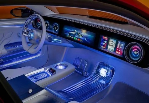 车厢风格一看就很奔驰,贯通式的联屏看起来熟悉,只是连两侧圆形出风口内部都加入了能显示温度的屏幕,十分炫酷。简约化的布局提供丰富的灯光体验,包括中央扶手处的杯架、手机格,下方储物格、门板储物格等部分,很有科幻色彩。车机采用全新BM OS操作系统,流畅度也将大为提升。