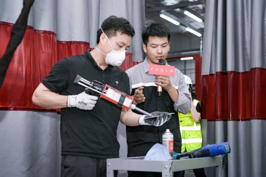 (图为安徽首家特斯拉直营钣喷中心钣金车间体验讲解)