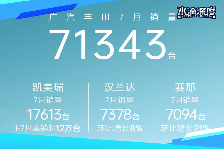 广汽丰田7月销量为71,343辆,前7个月旗舰车型占比超40%。根据官方数据显示,凯美瑞7月销量为17,613辆,1-7月累计销售超12万辆。汉兰达7月销量7,378辆,环比增长8%;赛那销量7,049辆,环比增长21%。