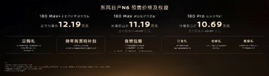 N6此次推出180 Pro、180 Max、180 Max+三个版本,全系标配20度以上大电池与180公里纯电续航,真正做到“起步即高配”。从10.69万元起的Pro版,到11.19万元起的Max版,再到12.19万元的Max+版,配置层层进阶,满足不同家庭用户对舒适与智能的差异化需求。