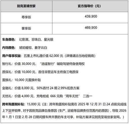 即日起,消费者可通过多重渠道下定:别克官网、iBuick App、Buick小程序、别克抖音直播间,或全国授权经销商门店均可办理。为回馈首批用户,别克特别推出限时礼遇:2025年12月31日24点前完成线上下定并锁单,且于2026年2月28日24点前提车开票的车主,可享五重上市专属福利;若提车开票时间处于2026年1月1日至2月28日期间,更可叠加享受15,000元跨年购置税补贴,尊享双重优惠。