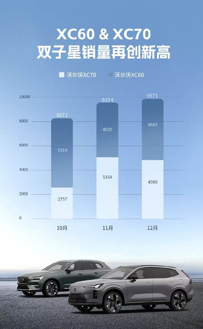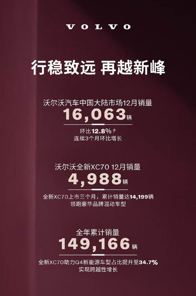 在2025年车市年末收官的激烈角逐中,沃尔沃汽车交出了一份暖意渐显的成绩单。官方数据明确显示,12月沃尔沃在中国大陆市场销量达到16,063辆,实现12.8%的环比增长,这也是其连续第三个月保持环比正增长态势,以稳健上扬的姿态为全年市场表现画上句点。从车型贡献来看,全新XC70插混SUV与经典热销车型XC60成为绝对销量主力,两者合计贡献超九成增长份额,不仅稳稳撑起销量增长的“半边天”,更直观印证了沃尔沃在新能源转型赛道上已找准核心方向,正加速驶入发展快车道。