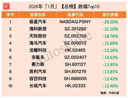 月度跌幅榜TOP10中,极星汽车、海马汽车、赛力斯A股、长城汽车港股等4只乘用车个股上榜。极星汽车更以-29.2%的跌幅成为1月总体表现最差的汽车股。