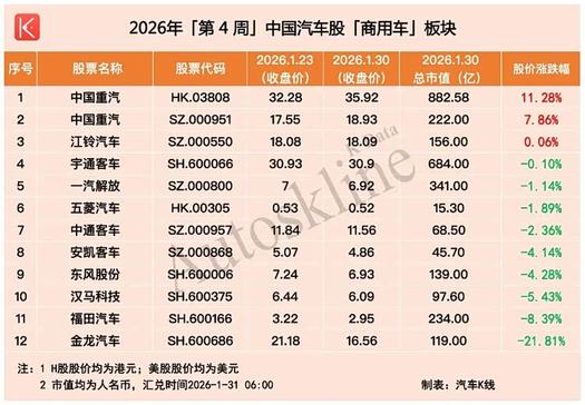 其中,中国重汽成为本周最耀眼的明星,其港股和A股分别以11.28%和7.86%的涨幅包揽总榜涨幅前两位,1月28日港股市值一度突破千亿港元。这或与市场对重卡行业复苏预期、2025年第四季度出口销量占比超50%、盈利结构向好有关。