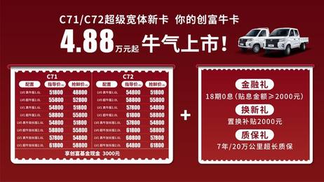 今日,东风小康宣布旗下全新微卡车型C71/C72正式上市,官方指导价区间为5.18万-6.48万,前1万名购车客户可享全系普降3000元的抢鲜价(3000元创富基金)4.88万-6.18万。其中,C71提供8款车型,售5.18万-6.18万;C72提供8款车型,售5.48万-6.18万。同时官方公布了购车优惠政策:2000元金融礼、2000元换新礼、7年/20万公里超长质保服务等。
