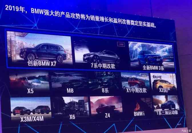 2019年1月16日,宝马集团以“豪华新境”为主题,展示了旗下大型豪华车全系产品,借此时机也彰显出其提升产品定位、品牌形象的决心。据官方介绍,2019年宝马将在中国市场推出21款新车型。在SUV领域,大型SUV宝马X7、全新宝马X6、国产宝马X2、中期改款宝马X1蓄势待发,宝马X3 M、宝马X4 M两款高性能SUV也有望引入国内。轿车方面,双门轿跑车全新宝马8系、中期改款宝马7系、全新宝马3系、宝马1系三厢运动版将会在今年上市销售,备受车迷关注的全新宝马Z4、宝马M8同样有望进口国内市场。新能源车部分,宝马i8敞篷跑车、更长续航的新款宝马i3将会在上半年上市。
