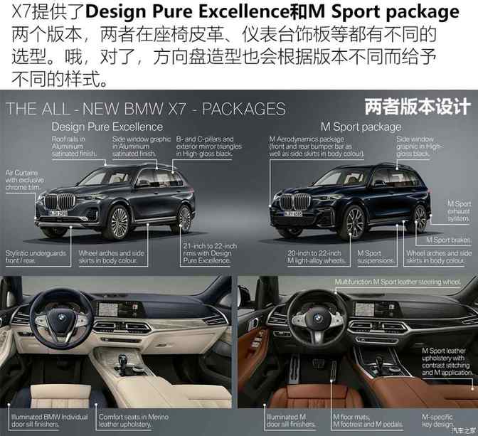 从侧面来看,宝马X7车身线条工整,符合大型SUV应有的气势。其长宽高分别为5151/2000/1805mm,轴距达到3105mm,相比奔驰GLS,除了车身高度外,其它方面都有优势。车尾方面,X7多边形LED尾灯组在比例上呼应了前灯组的设计。与其他宝马车型一样,宝马X7将推出两种不同版本车型以迎合消费者的个性化需求,分别是卓越套装和M运动套装,它们在车身以及内饰细节方面存在着一定的区别。
