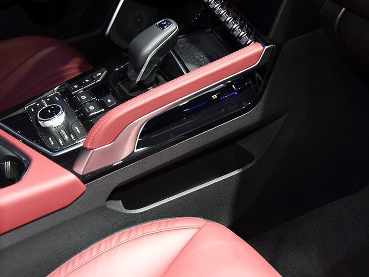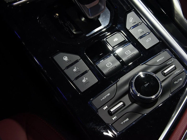 电子档把前面有一个无线充电装置,而后面则有很多功能按钮,比如座椅加热、电子手刹、自动驻车360全景影像等等,还有个多媒体旋钮装置。中控台下方还有一个储物空间,比较厚道。