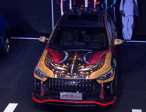 车头的龙头样式与枪头相融合,并在周围使用类似唐草样式的设计语言,为新车营造出更强的视觉感受。在大灯底部依旧使用与上方类似的造型,使新车看起来好似带着头盔的视觉感受。大面积的中网设计,中间使用镀铬样式的饰条,使新车更具力量感。在大灯灯角的位置使用了流苏的设计,使新车更具国风。