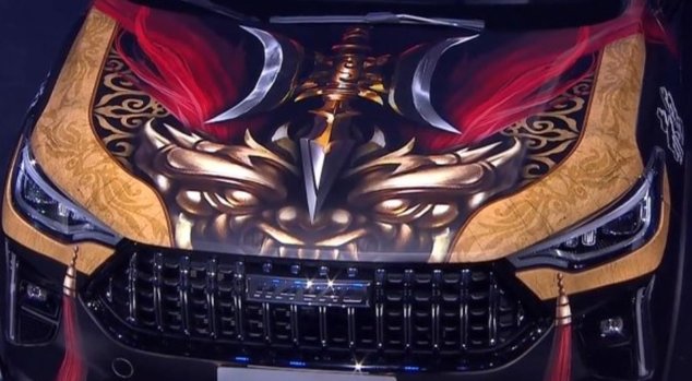 新车基于哈弗赤兔普通版打造而来,并在车身周围增加了中国风的配色。哈弗赤兔激擎版前发动机盖使用类似中国古兵器的枪与龙头的造型。西拿钱凸出的古兵器的样式,并使用了基色的配色,在枪刃周围使用了银色的配色,使新车更具视觉冲击力。在枪头两侧的红色丝绸样式的造型,处理过细节后,使新车更具视觉层次感。