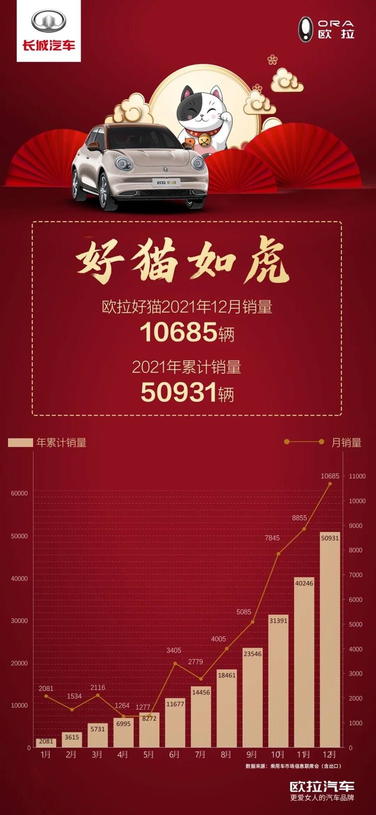 来自乘用车市场信息联席会数据的数据显示,欧拉好猫2021年12月销量10685辆,在12月份成功破万。而2021年欧拉好猫实现全年累计销量50931辆,摘得A0级BEV市场年度销量桂冠。在这样的利好加持下,欧拉品牌2021年累计销量也达到了135028辆,欧拉品牌2021年度增长140%。