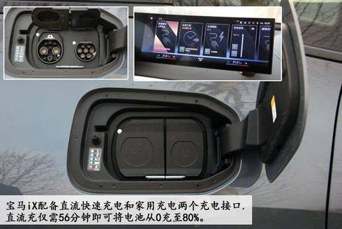 宝马iX配备直流快速充电和家用充电两个充电接口,直流充电可以接受最大100千瓦的充电功率,仅需56分钟即可将电池从0充至80%。在交流充电最大功率11千瓦的情况下,仅需10.75小时即可完全充满。
