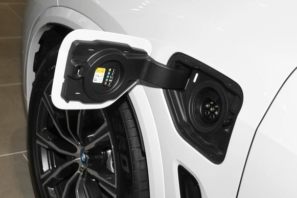 车身侧面,宝马X5 PHEV的线条饱满有力,块头感也比较足。再加上20英寸的轮毂,让整个车身看上去的加的大气。尺寸方面,长宽高分别为4930*2004*1767mm,轴距为2975mm。宝马X5 PHEV的充电口在右侧翼子板处,这也表明了其新能源车型的身份。