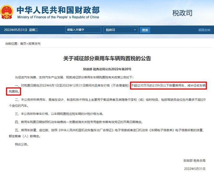 5月31日,财政部、税务总局在官网发布了《关于减征部分乘用车车辆购置税的通知》,这预示着此前国务院关于“拉动汽车消费和提振市场的政策,放宽汽车限购,阶段性减征部分乘用车购置税600亿元”的方正政策真正落到了实处。