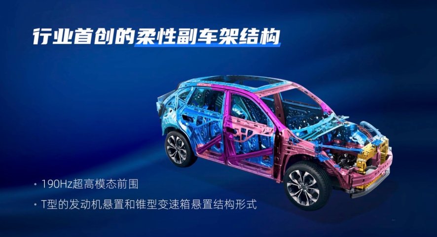 其采用了行业首创的柔性副车架结构,190HZ超高模态前围,T型发动机悬置和锥形变速箱悬置结构。极大程度地降低了车内由于结构共振引起的噪音,同时减少机械传动发出的噪音。