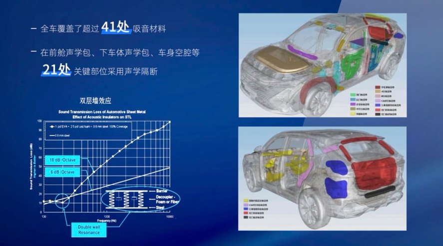 全车还覆盖了41处吸音材料,在前舱、下车体、车身空仓等21处关键位置采用了声学隔断处理,实现了车辆怠速状态下噪音低于36dB,车辆怠速状态下震动0.02m/s²优于同级的双重标准。