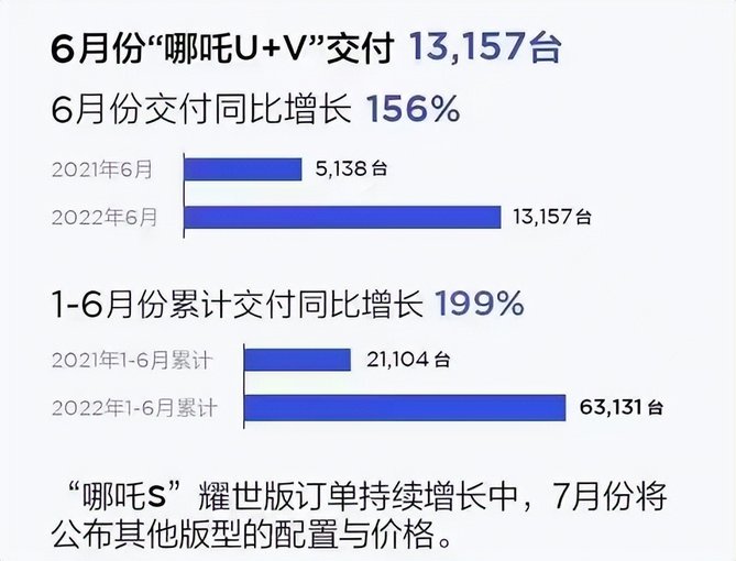 2022年1-6月份(上半年)哪吒汽车累计交付量达63131台,同比增长199%。