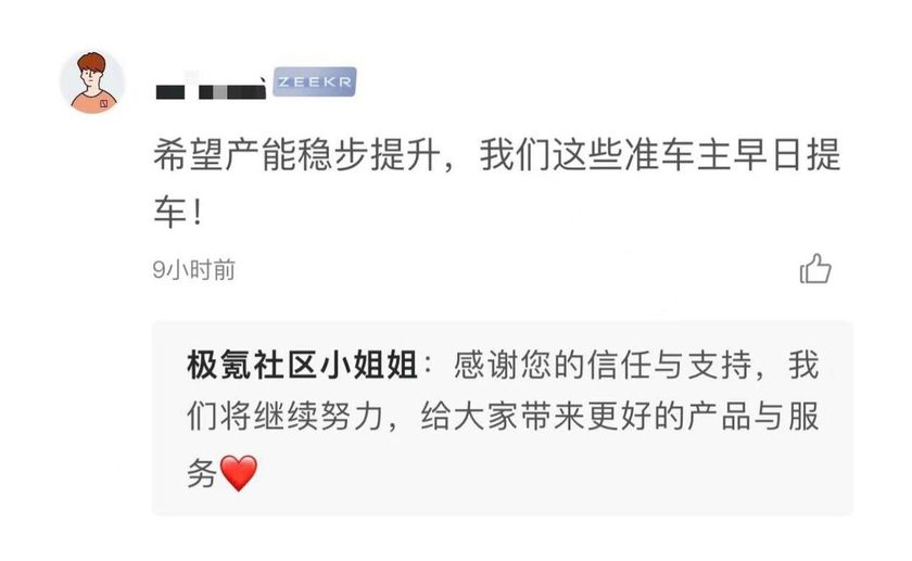 昨天一早,极氪APP社区管家发布了交付数据的帖子,很快收到用户几百条的评论,用户的评价中,既有提车用户表达了喜悦,也有用户给极氪的鼓励,也有不少“等提车”的用户表达了期待。