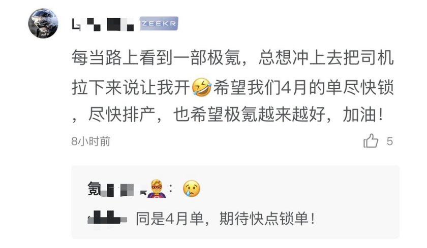 统计真实用户的评价,《新电图》了解到,确实有早期订车的用户,直到最近才提了车,也有用户表示,从2月下订至今,也还没提到车,有的用户则说,4月的订单至今还没锁单(编者注:4月极氪001新增订单超过1万辆),希望早日提车。