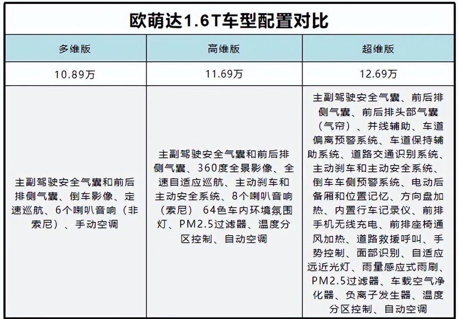 接下来看车型,欧萌达1.6T共三款车型,分别命名为多维版、高维版和超维版,价格分别为10.89万、11.69万和12.69万元,价差拉得并不大。比如顶配和次顶配,价差为一万元,那么这一万元多了哪些呢?