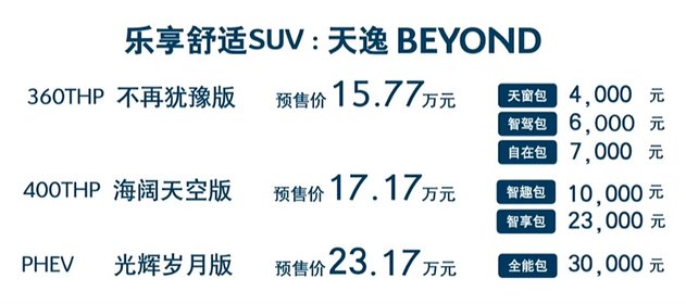 在《车壹圈》看来:天逸BEYOND首先在外观设计就给足了我们新鲜感,全新的前后灯组让人眼前一亮。同时,重新布局的中控屏和全新的车机系统也让新车在车内有了明显升级。另外,成熟的1.6T和1.8T发动机也保证了天逸BEYOND的行驶品质,PHEV车型满足了消费者对新能源动力的需求。而新车所推出的选装包服务,更能让消费者能根据自己的实际需求选择配置,让整车在价格和配置选择上更有优势。