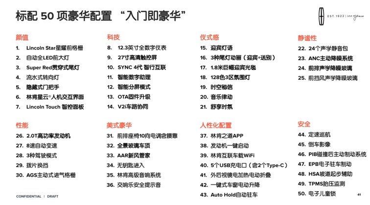 说实话一天的试驾有点意犹未尽,因为林肯Z身上还有很多惊喜,25.28万起售,这个价格买到如此豪华的配置,在这个级别车型中,性价比非常高。下面我们罗列出林肯Z全系标配的50项“入门即豪华”的配置供大家参考,如果你觉得BBA满大街都是也不那么香了,那林肯Z绝对是个很好的选择。
