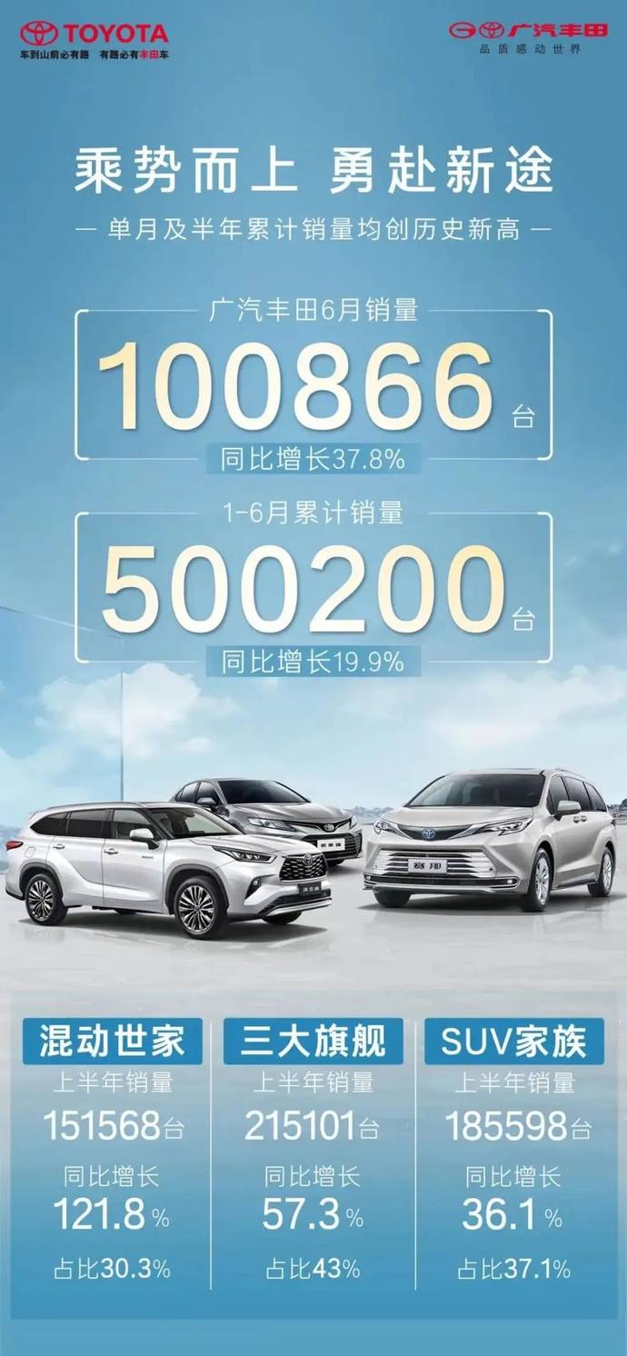 所有车企中,今年上半年销量同比上涨的只有两家,一家是比亚迪,一家是广汽丰田。在新能源时代,比亚迪有这样的成绩无可厚非。但广汽丰田作为以燃油车为主销的传统老牌车企,能在如此大环境下逆势上行,实属不易,但也可窥见它的实力。