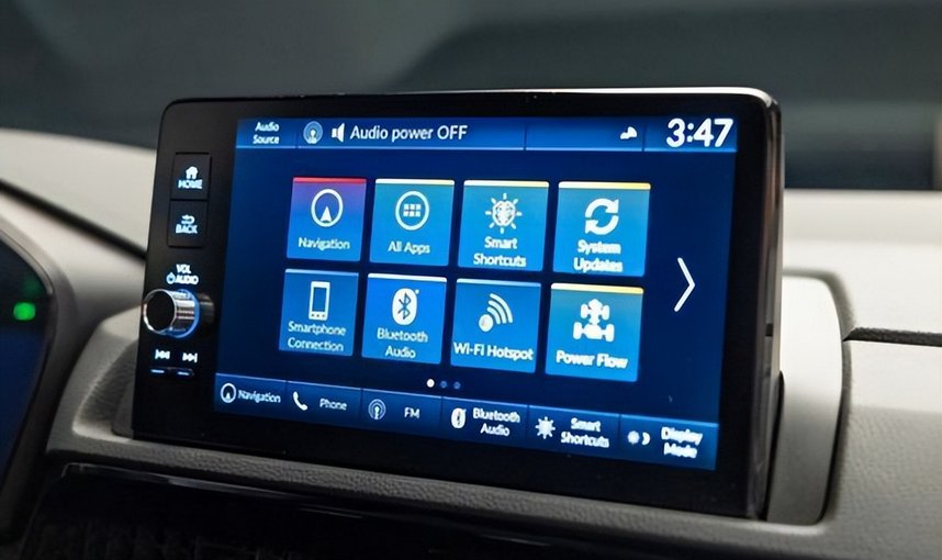 把目光转移到车内,乍一看2023款CR-V的内饰设计似乎还是老款的风格,但是仔细一瞧就会发现其中另有玄机。比如中控台饰板位置非常吸睛的蜂窝状造型装饰板,实际上是隐藏的空调出风口,同时我们还发现新款车型的多媒体操作实体按键,也别出心裁地设计到靠近驾驶员一侧的中控液晶大屏之上,这可谓是极其少见且实用的设计,毕竟现在很多消费者非常讨厌看似炫酷却不实用的全触控操作方式。
