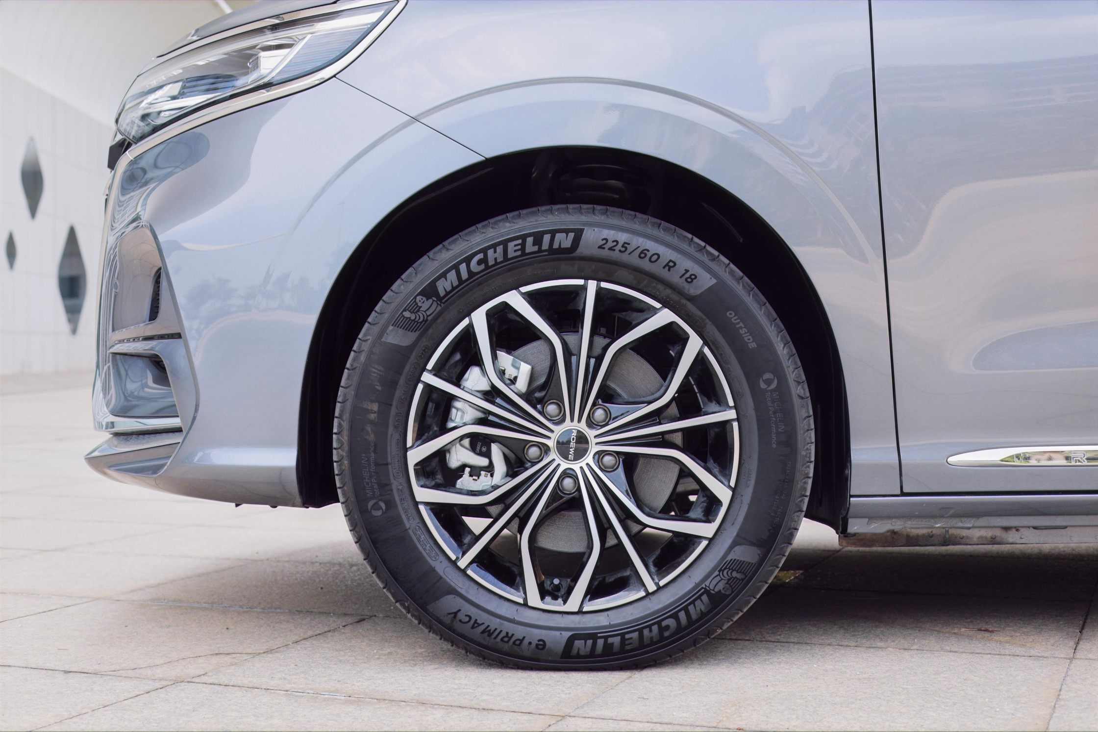 从侧面就能完全感受到全尺寸 MPV 的魅力,长宽高分别为 5016*1909*1796mm,轴距达到 3000mm。不仅保证了内部空间的充裕性,也使得装载能力得到充分发挥。此外,荣威 iMAX8 EV 所搭配的 18 英寸的花瓣式轮圈也是格外的亮眼,轮胎采用的是主打静音舒适的米其林 e・PRIMACY 轮胎,无论是耐磨性还是舒适度都表现优秀。