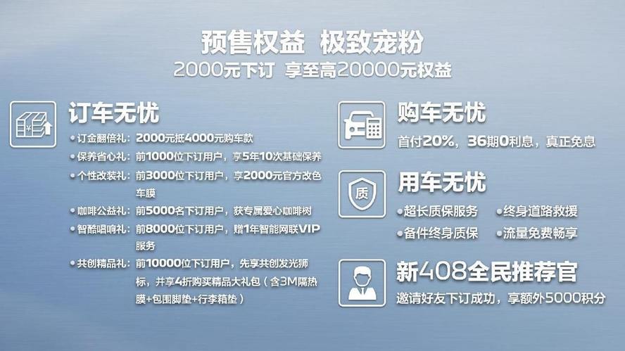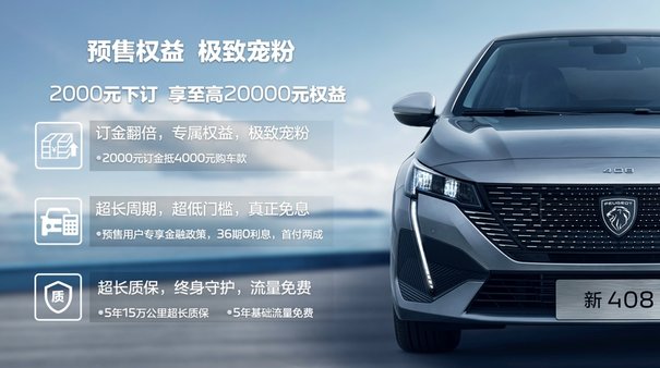 “新408预售宠粉日”当晚,“快乐男团”苏醒、张远和王铮亮化身新408福利官,现场公布预售福利:订车阶段,在2022年8月21日前下订2000元的用户,可享“订金翻倍礼、保养省心礼、个性改装礼、咖啡公益礼、智酷唱响礼、共创精品礼”;购车阶段,2022年8月21日前下订用户,可享36期0利息,首付20%;用车阶段,东风标致还为新408车主提供5年15万公里整车超长质保服务、原厂备件终身质保、终身道路救援、5年基础流量免费畅享,让你用车生活更无忧。