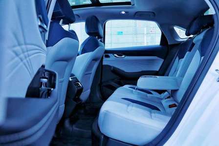 后排的腿部空间很宽裕,全车座椅采用了翻毛皮和皮质材质进行拼接,内部是柔软的填充物,乘坐舒适性非常出色,并且后排中间位置地台凸起不会很高,不会影响中间的腿部空间。