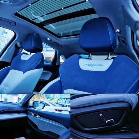 这次探店未能拍到青绿版车型,主要是它太受欢迎,被客户开去试驾了。不过我们还是得说下“只此青绿”联名版车型,据介绍,该联名设计基于文化共创理念,以中国传统山水画为创意灵感,分别提取了蓝铜矿的“石青”和孔雀石中的“石绿”色作为专属的漆面颜色。只此青绿版车型拥有独特的Alcantara内饰,头枕上还有Preface的刺绣车标,精致感和氛围感营造的很足。另外,只此青绿版车尾装有专属的四出排气布局,普通版车型为椭圆形双边双出排气。