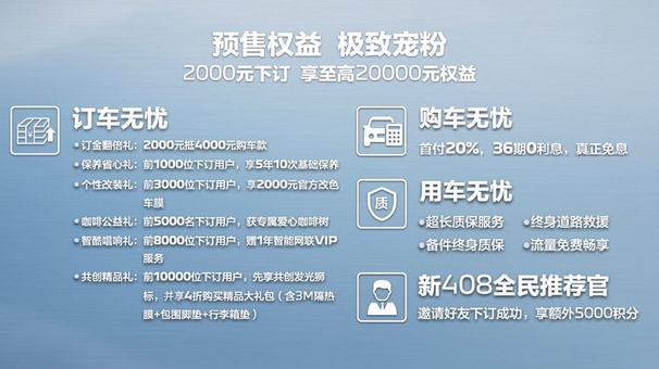 另外,东风标致还从订车、购车、用车三个阶段,为用户提供了三大无忧好礼,2000元下订,享至高20000元权益,全方位满足“后浪青年”的胃口。
