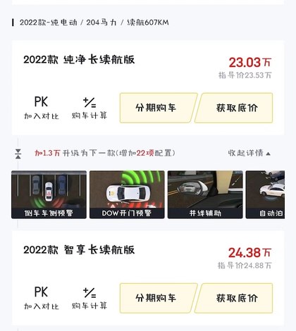 根据配置对比,小编最推荐的是指导价24.88万的智享长续航版,相比指导价23.53万的纯净长续航版,只需要加多1.3万,即可多出自动泊车、并线辅助、主驾12项电动调节和记忆、前排座椅按摩以及30色氛围灯等22项配置,并且这些配置还是比较实用的,值回票价。