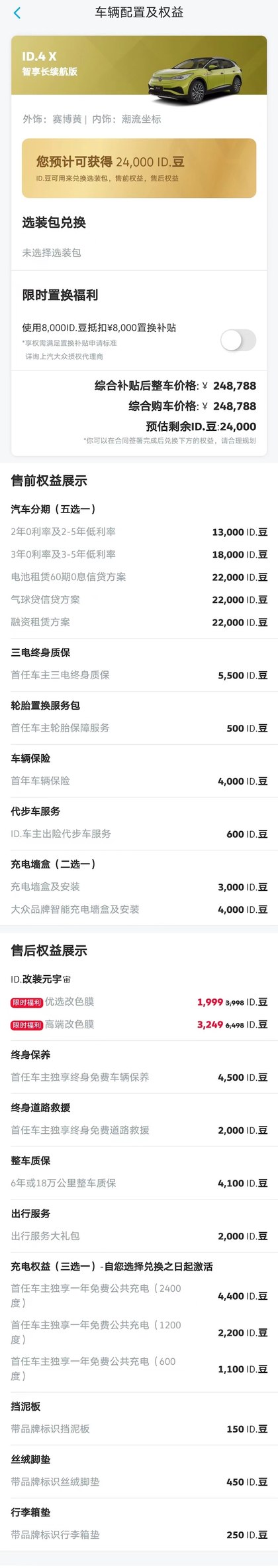 3,用手机打开大众ID小程序,以智享长续航版为例,购车即可获得24000 ID豆,这些ID都可以进行车辆分期、三电终身质保,轮胎置换服务等等优惠政策。