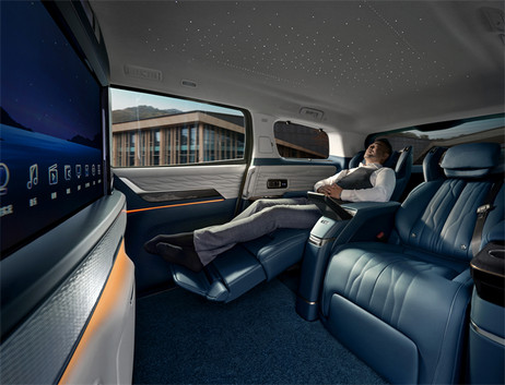 首先,新车前脸中网位置偏下,与下侧护板相呼应,形成了梯形造型,中网上沿与机盖之间有一条镀铬饰条,增加了立体感,新车的大灯由7颗纵向布置的LED灯组构成,其上部有三段灯带,张扬霸气。还有它四座版独有的双色车身,符合年轻化时尚潮流。双侧电动侧滑门,简约动感的车身线条,彰显它的豪华定位。