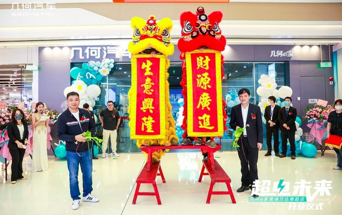 更热闹的是,现场还有醒狮助场。在喧天的锣鼓声中,广东铭智集团董事长章明智和几何品牌南区营销事业部广海大区总经理伍楚星移步为瑞狮点睛,随后几何e家在大家的掌声中正式开业,路过或者有兴趣的朋友可以进门观摩一番。