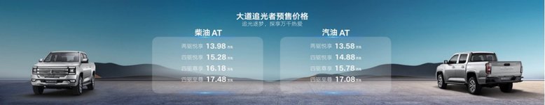 追光者全系标配8AT自动档,其中,柴油版4款车型,预售价格13.98万到17.48万!汽油版4款车型,预售价格13.58万到17.08万!
