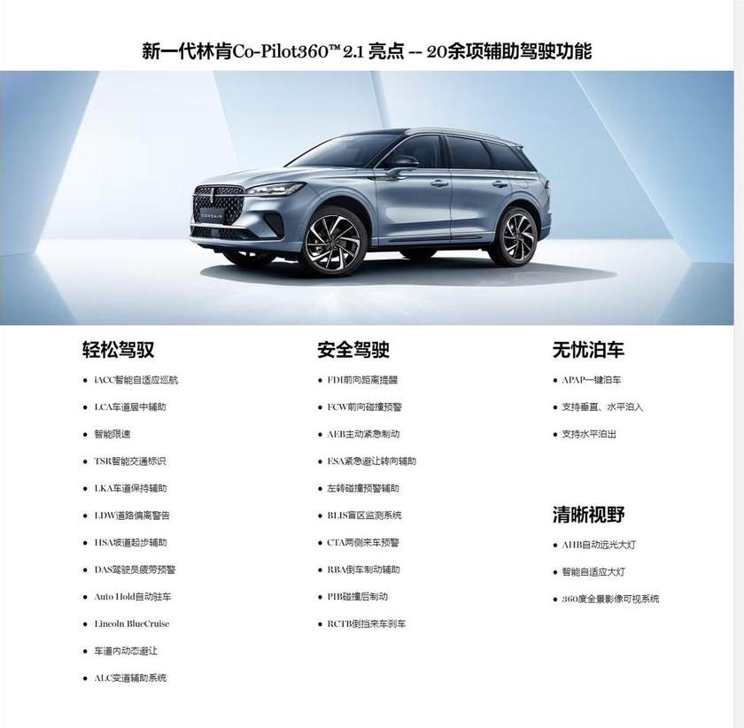 如果想进一步减轻驾驶压力,全新冒险家也提供了更高级的智能驾驶套件——Lincoln BlueCruise 主动驾驶辅助。这套系统可实现在国内高速和城市快速路特定路段实现“准自动驾驶”整合自适应巡航、车道居中、并通过智能限速实现自动控制加减速和转向变道等。尤其值得一提的是,系统新增的主动避让和ALC主动变道辅助再一次“碾压同级” “轻松越级”,就连以安全著称的沃尔沃XC90也不具备这些能力。