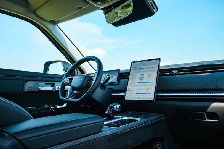 新车还是奇瑞首款竖屏设计的车型,13.2英寸中控大屏配备了高通8155芯片,流畅程度表现不错,但精致感方面差了一些。此外,本次试驾的高配车型还搭载了50W无线快充、540°全景影像、W-HUD等科技感配置,对于年轻人而言比较有吸引力。