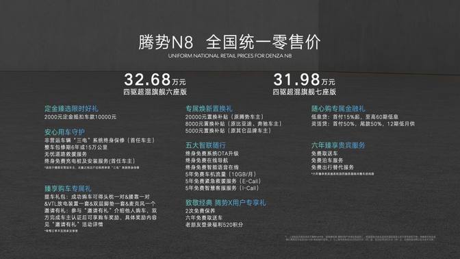 8月5日,腾势N8正式上市,这是一款中大尺寸SUV,有7座和6座两款车型,售价分别为31.98万元、32.68万元。