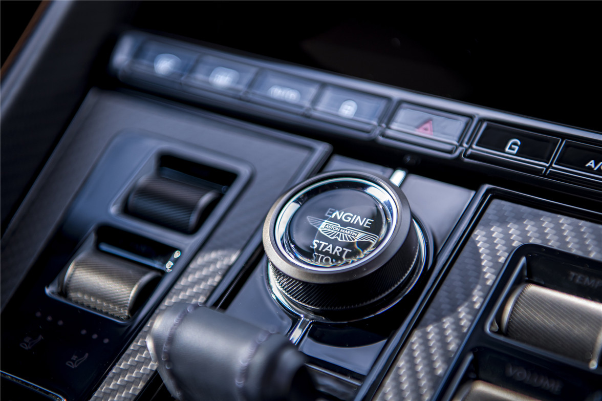 值得庆幸,在追求现代化的同时,阿斯顿·马丁保留了大量高质感实体按钮,包括温控、风量、音量滚轮开关,主要驾驶功能键(减震、排气、主动安全系统)以及倒车影像和部分空调开关。驾驶模式通过中控台的大旋钮选择,启动/停止键置于旋钮中央。中控台下部开敞区域配备了无线智能手机充电垫,也可使用中央扶手箱内的有线连接端口进行充电。