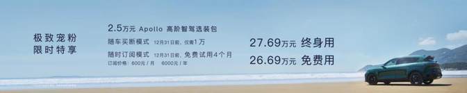 不过,这套领航辅助智驾是要收钱的,在今年 12月31日前下定买断,价格是 1 万元;如果在12月31日前下定车辆但不买断,则可免费使用4 个月,之后采用每月 600 元或每年 6000 元的付费订阅形式使用。