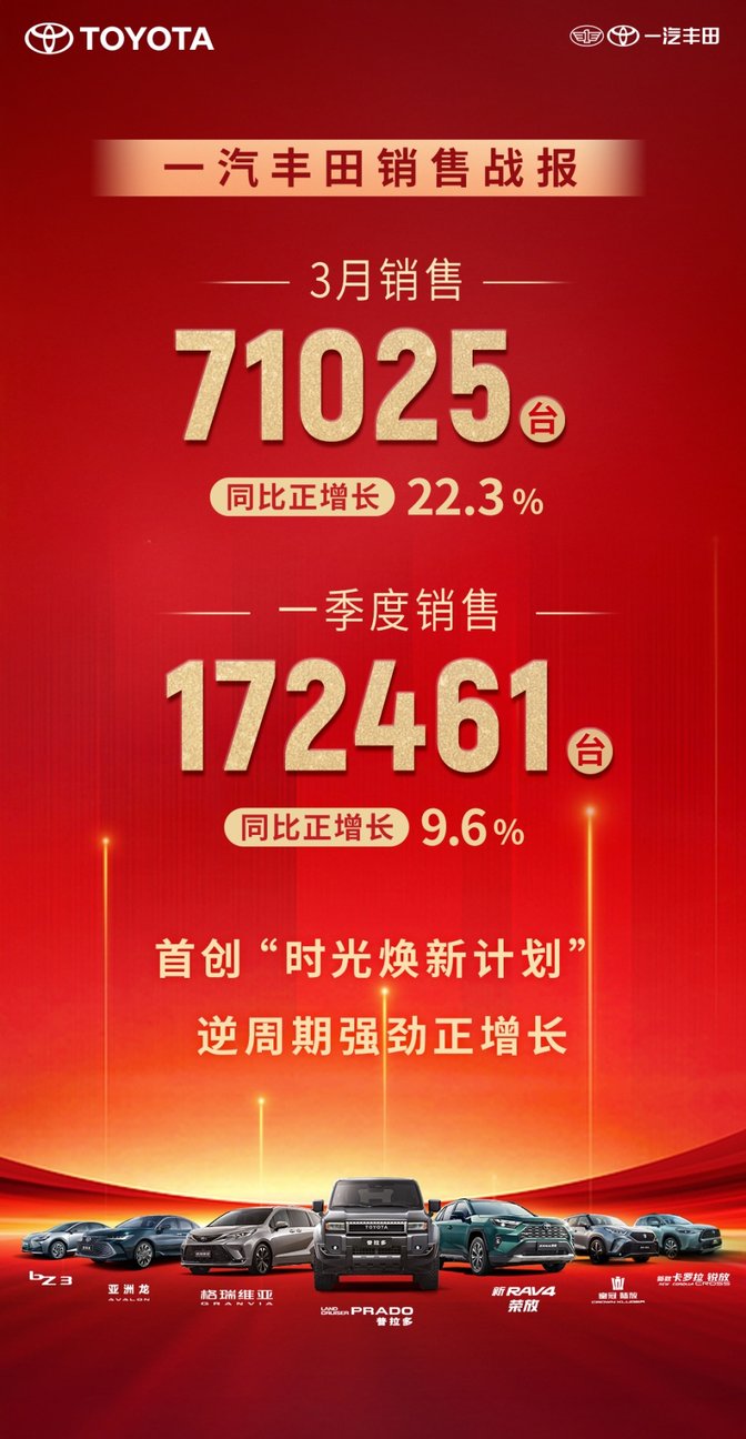 兄弟们,车圈又出大新闻了!一汽丰田刚公布的2025年一季度战绩,直接刷屏——狂卖17.2万台新车,比去年涨了9.6%!尤其是3月份,7.1万台的销量同比飙升22.3%,在一众合资车企里简直像开了挂。这成绩单到底怎么来的?咱们今天唠个明白!