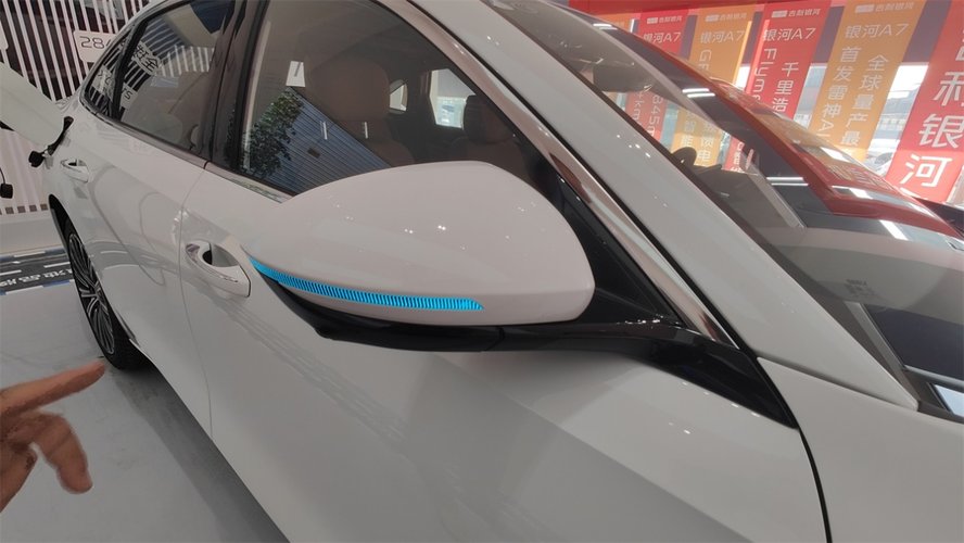 外后视镜上的转向灯整合了更多的功能,包括充电时的状态指示灯,和智驾功能开启时的外部警示灯。点亮之后的视觉效果很亮眼。
