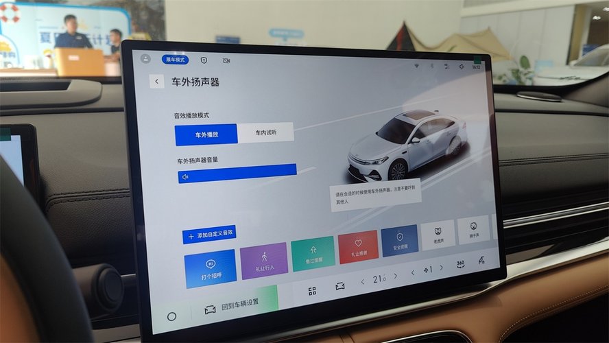另外值得一提的是,带有“千里浩瀚”智驾的配置,都绑定了一个车外扬声器,而且附带了不少功能。除了能调节音量、选择试听位置之外,还有很多根据不同场景预设的可选播报音频。为什么会有这样的一个配置呢?按照销售的解释,这在很多需要提示车外行人的场合下,能很好地替代直接鸣喇叭的方式,显得更加文明。不错的设想。