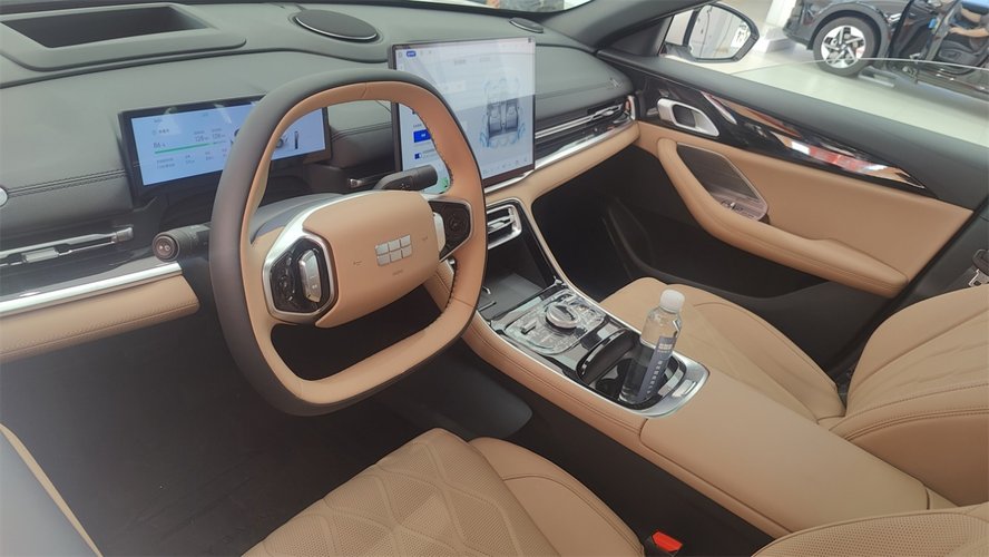 内饰的整体设计已经是很熟悉的银河家族风格了,包括两幅式方向盘、更贴近传统化审美的黑色与米色内饰搭配,以及座椅的设计风格。大部分能够用手部触及的部分都做了处理,包括中控台上方采用了软性的搪塑材质,中控台下方都使用了手感很柔软的仿皮包裹。