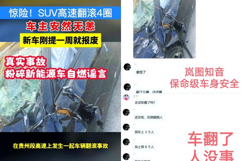 去年12月,贵州高速路段的一场交通事故,岚图旗下另一款车型知音连续翻滚4圈,导致车身出现严重损坏、车内安全气囊全部弹出,但车门可以打开、电池包没有起火、冒烟。幸运的是,司机及两位乘客因系好安全带平安无事,事故发生后,司机表示“死里逃生,但想起来仍心有余悸”。