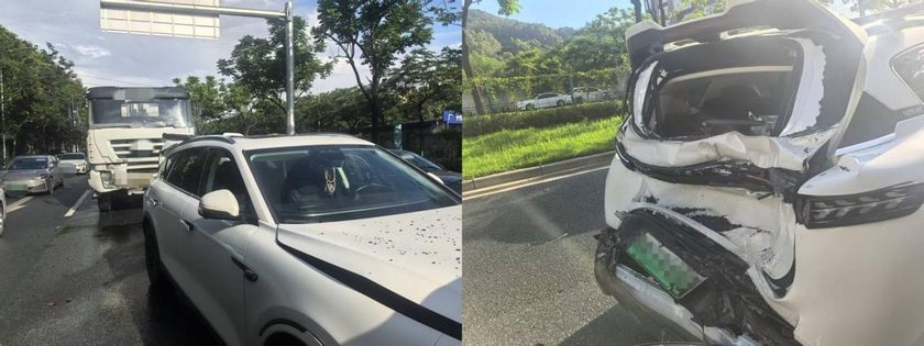 事故发生时,岚图车主王先生(化名)正驾驶一辆老款岚图FREE等待前方红灯,突遭后方一辆重型卡车追尾。巨大的撞击力导致车辆瞬间猛烈前冲,并与前方车辆发生二次追尾,最终造成与前方五车连撞。岚图FREE不幸被前后车辆夹在中间成为“三明治芯”,王先生形容:当时就像一堵墙压了过来,瞬间手足无措。
