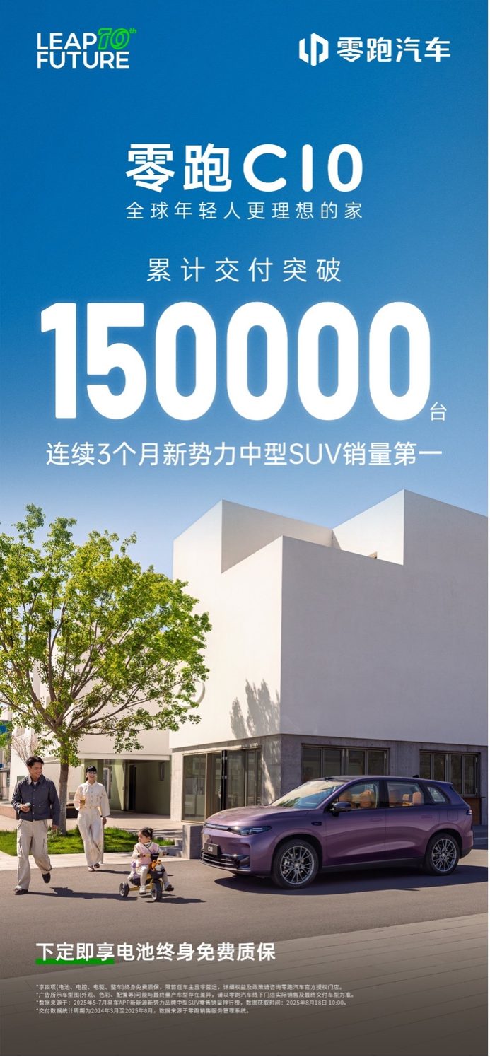 2025年8月18日,零跑汽车旗下全球战略车型零跑C10迎来里程碑时刻——上市仅16个月,累计交付量突破15万台,刷新零跑品牌在售车型达成此规模的最快纪录。依托越级产品力,零跑C10持续引爆市场,2025年5月至7月,已连续3个月蝉联新势力中型SUV销冠,并稳居2025年上半年新势力中型SUV销量榜首。此外,根据中国汽车流通协会和精真估联合发布的《2025上半年中国汽车保值率研究报告》,零跑C10更以纯电动中型SUV一年保值率第二的成绩,成为年轻家庭用户心中兼具价值与品质的理想之选。